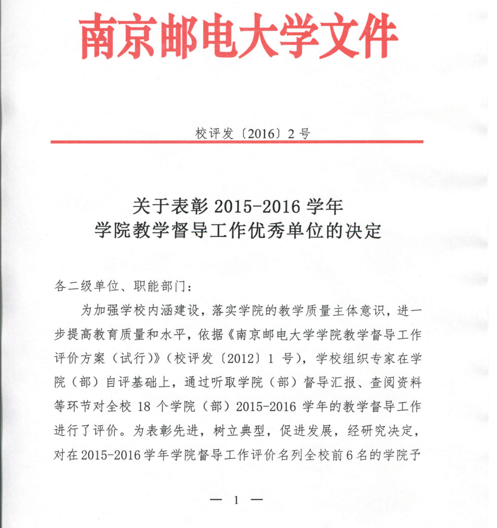关于表彰2015-2016学年学院教学督导工作优秀单位的决定