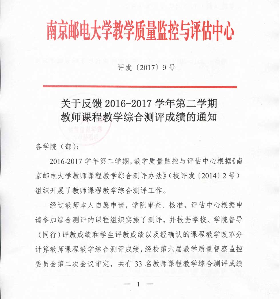 关于反馈2016-2017学年第二学期教师课程教学综合测评成绩的通知