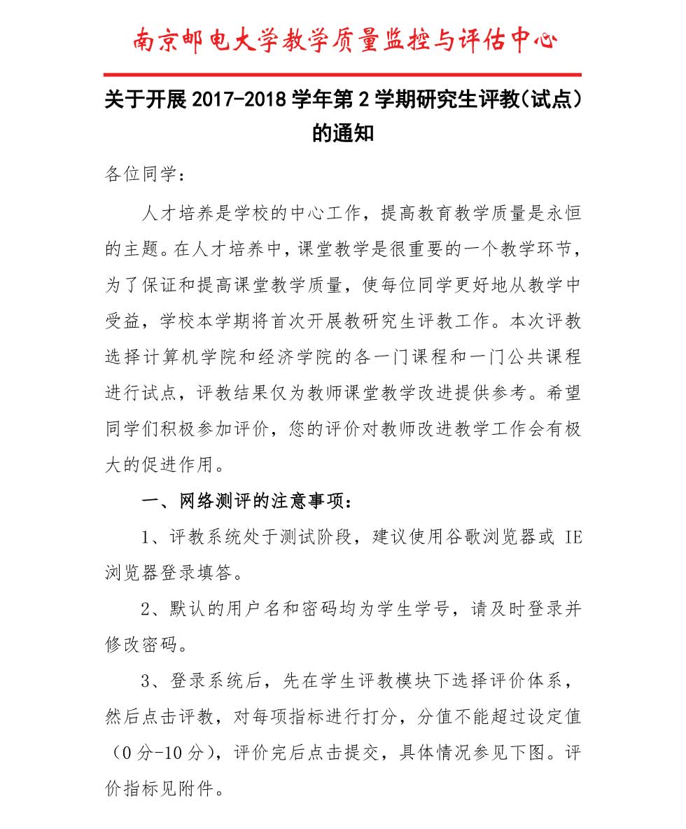 关于开展2017-2018学年第2学期研究生评教(试点)的通知