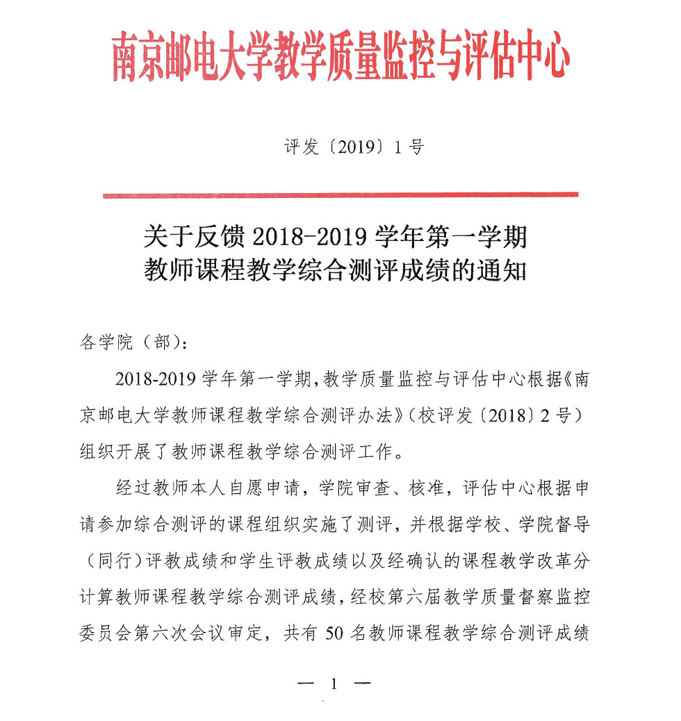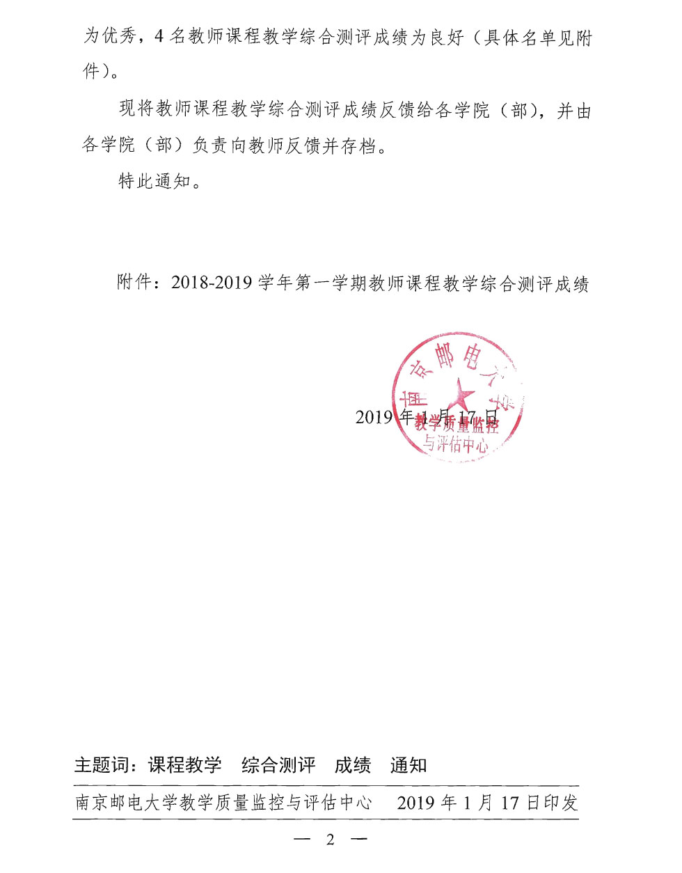 关于反馈2018-2019学年第一学期教师课程教学综合测评成绩的通知