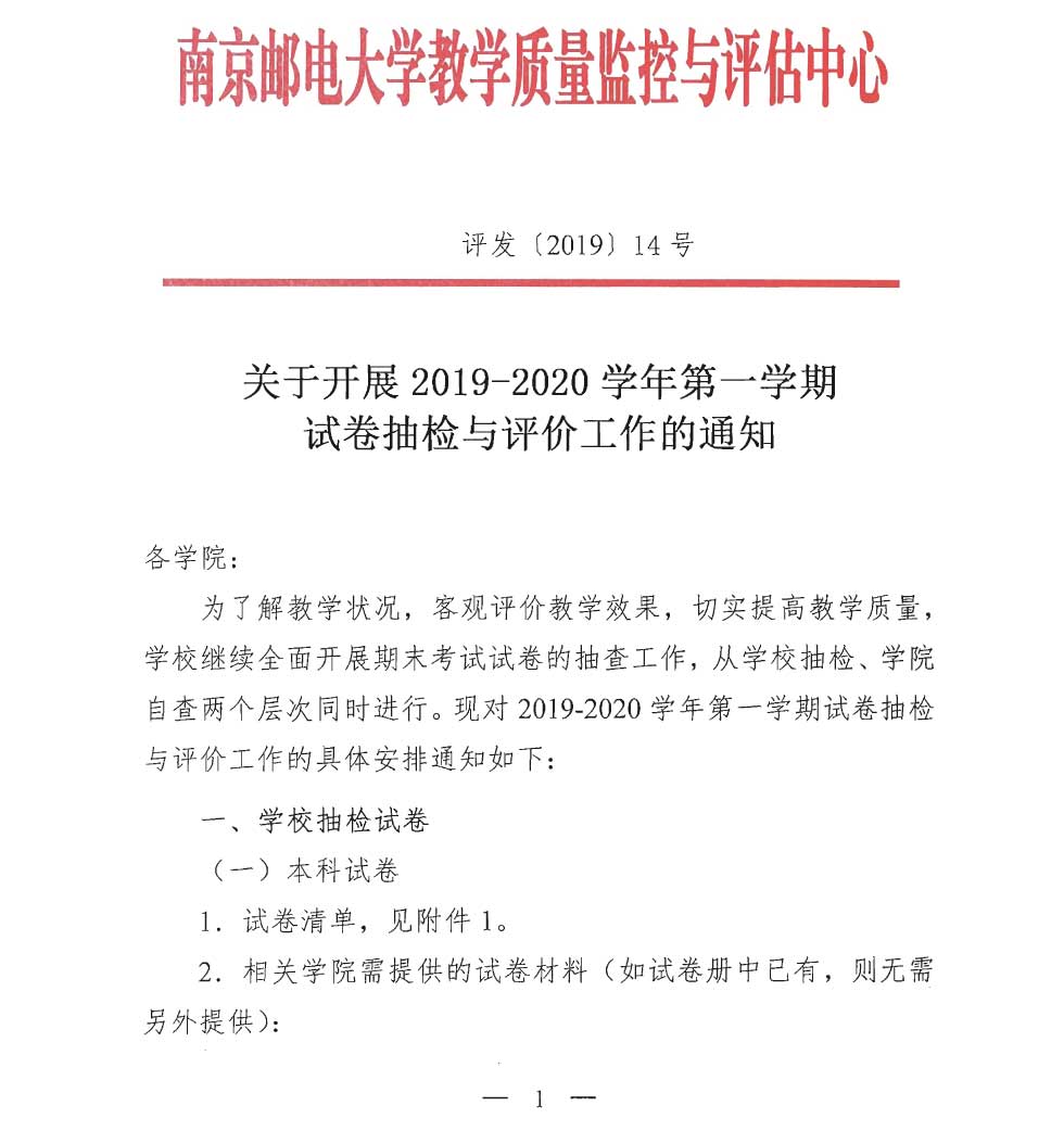 关于开展2019-2020学年第一学期试卷抽检与评价工作的通知